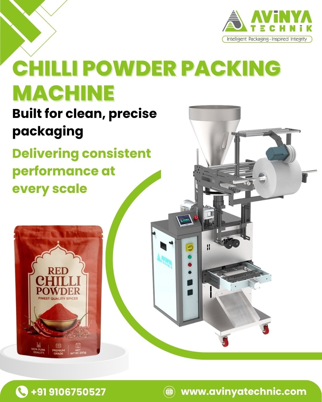 As a leading Chilli Powder Packing Machine Manufacturer, AVINYA TECHNIK focuses on delivering machines that combine durability with precision. Our systems are built with cutting-edge technology to provide dust-free operation, minimal wastage, and seamless packaging. Whether you are a small-scale business or a large production unit, our machines are designed to adapt to different production capacities with ease.
